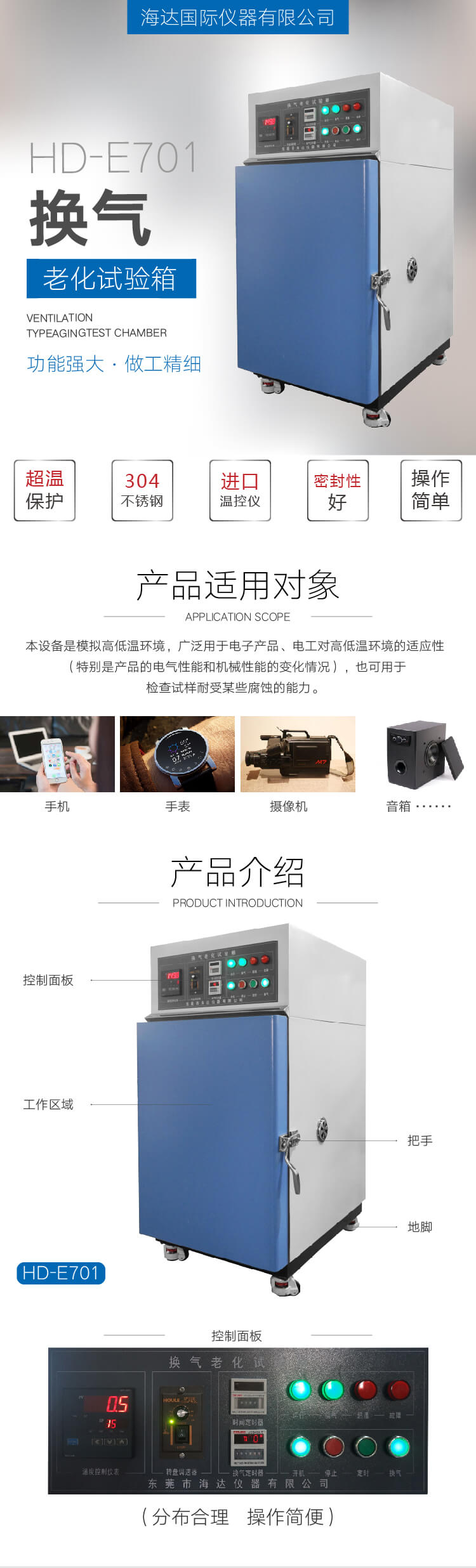 換氣老化試驗機適用于電線類、皮類、塑料類、橡膠類、布類等受熱前和受熱后變化特性。針對電線類在受熱時為維持箱內(nèi)新鮮的空氣,故特制換氣量的調(diào)節(jié)。