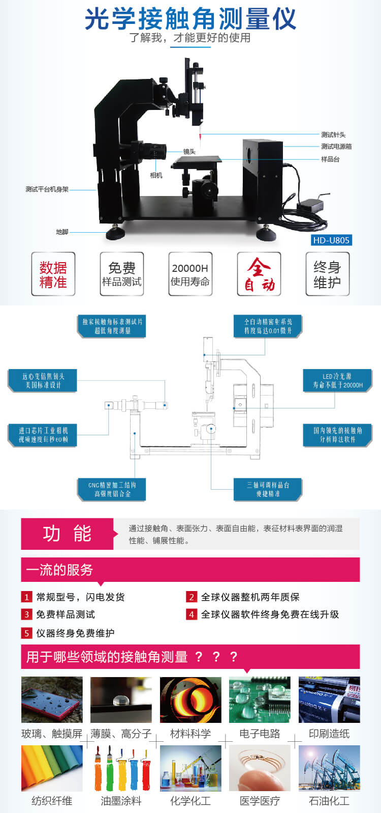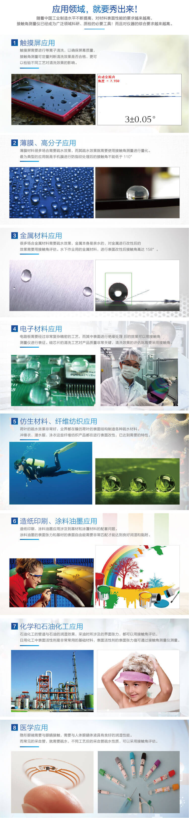 水滴角測試儀用于測試液體對固體的接觸角,即通過測量液體與固體間所形成接觸角的大小,判斷液體對固體的浸潤性。廣泛應用于硅晶、液晶、玻璃、纖維、合成材料、油墨、涂料、農藥等領域的測試與研究。