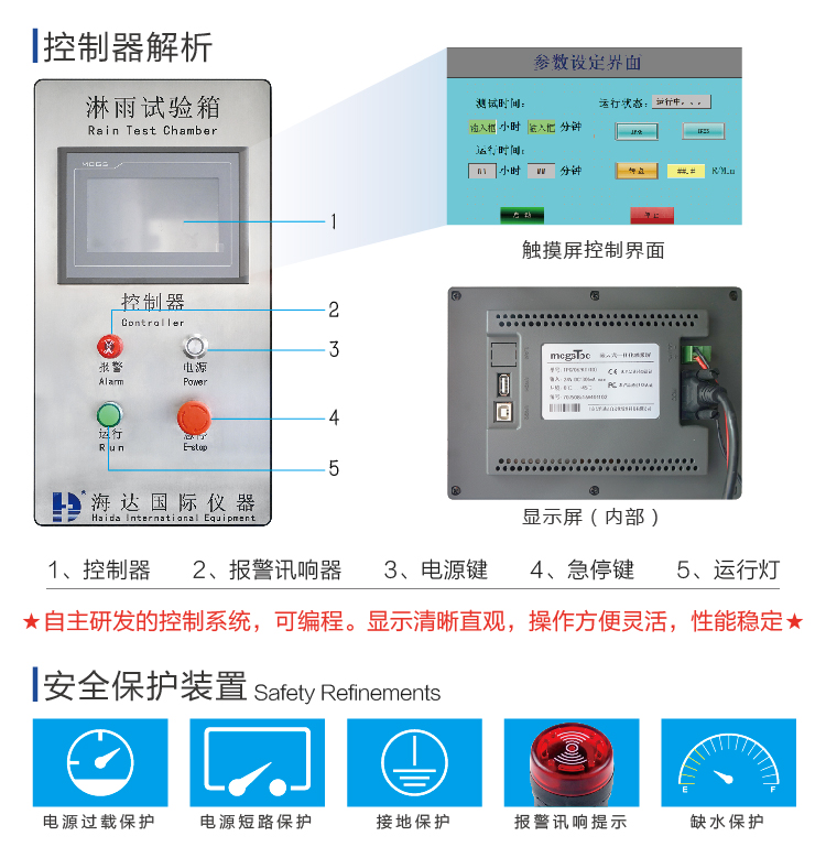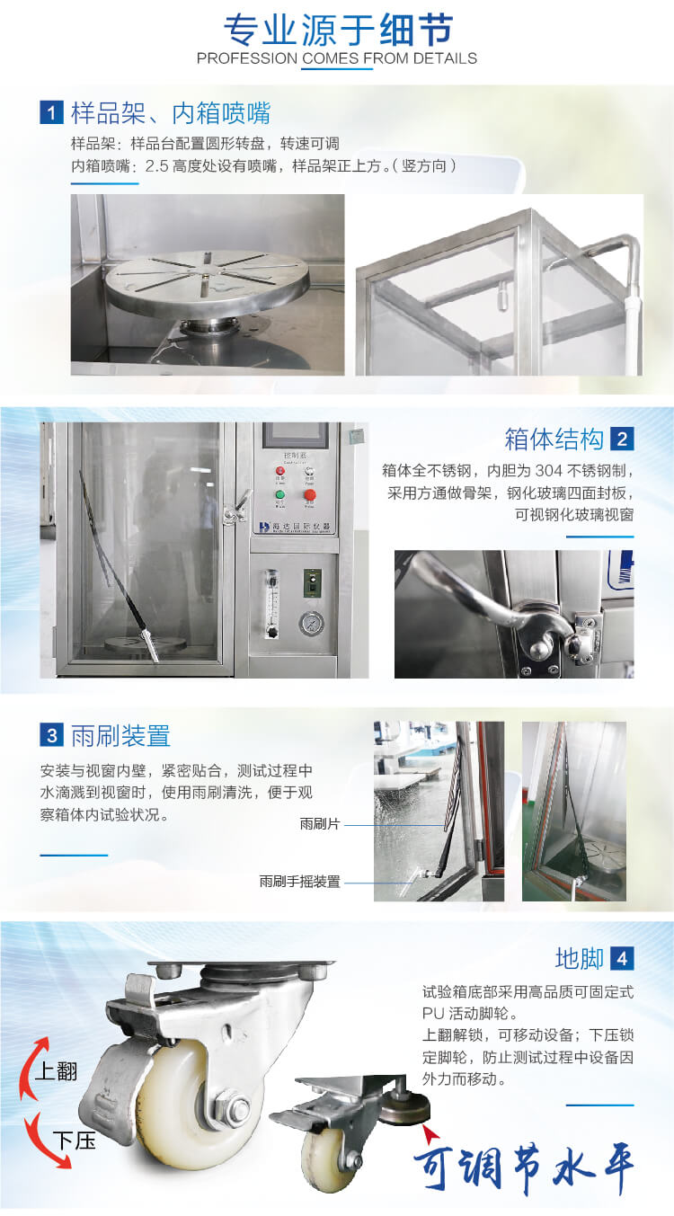 強噴水試驗箱IPX5-6適用于測試產品在淋雨的氣候環境下的貯存、運輸和使用時的性能試驗,該設 備主要用于對電工電子產品、燈具、電柜、電器元件、汽車、摩托車及其零部件等產品 在模擬淋雨的氣候條件下,對產品的物理以及其它相關性能進行測試。