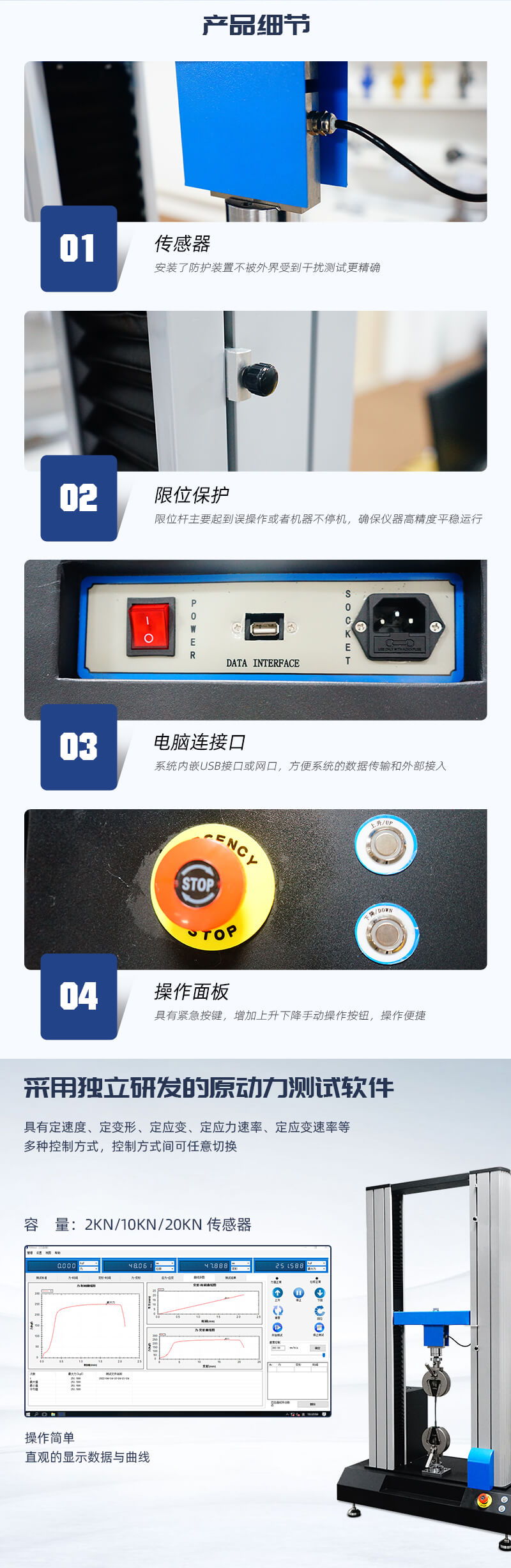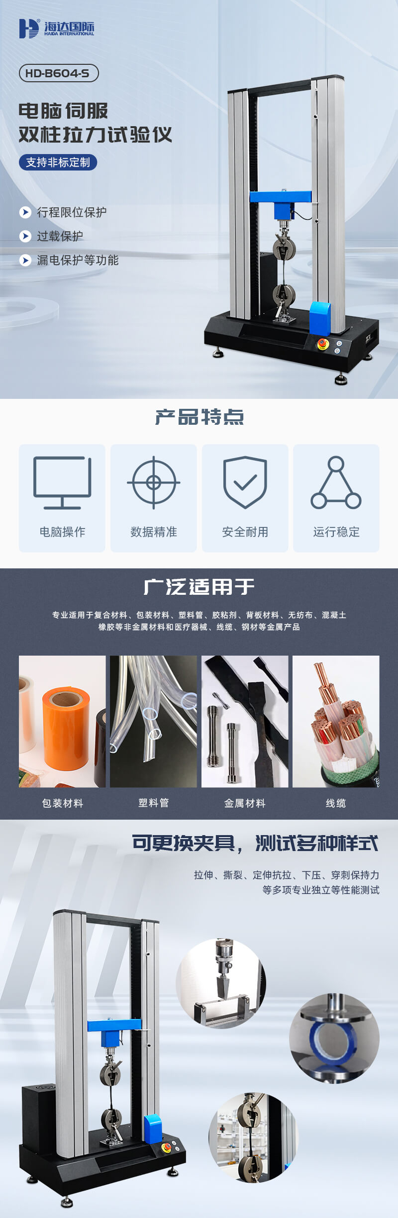 雙柱拉力試驗機專業(yè)適用于復(fù)合材料、包裝材料、塑料管、膠粘劑、背板材料、無紡布、混凝土、橡膠等非金屬材料和醫(yī)療器械、線纜、鋼材等金屬產(chǎn)品的拉伸、抗彎、壓縮、膠合強度、撕裂、穿刺力、開啟力、解卷力、拔開力等性能測試。