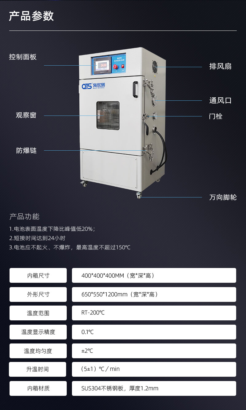 將充滿電的電池,放置一定的環境中,然后用導線連接電池正負極端,并保證全部外部電阻值嗎,試驗過程中監測電池表面溫度變化,當出現下兩種情形之一時,試驗終止:電池應不起火、不爆炸,最高溫度不超過150℃。
