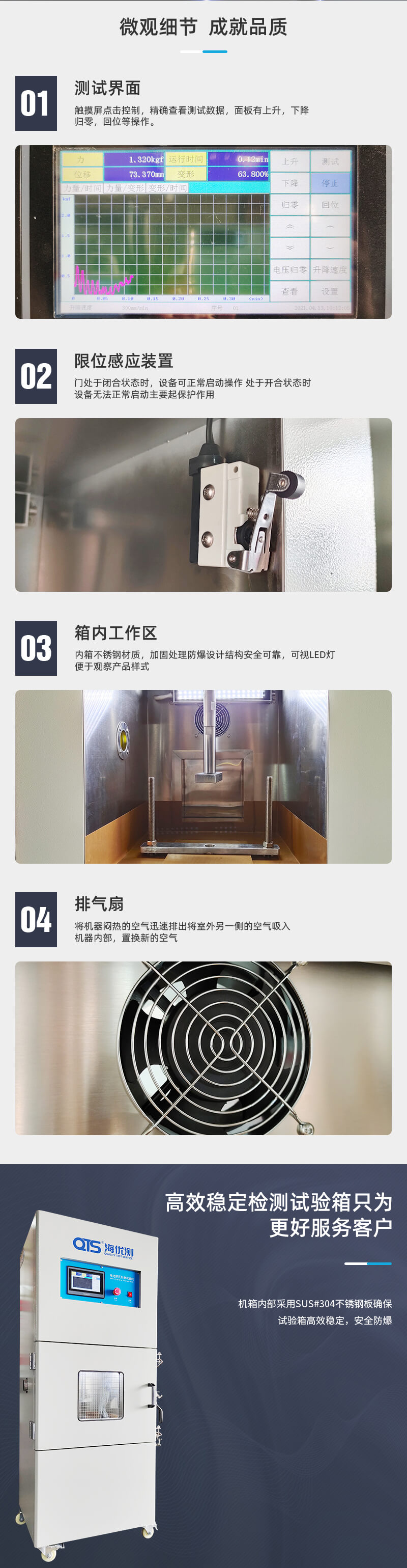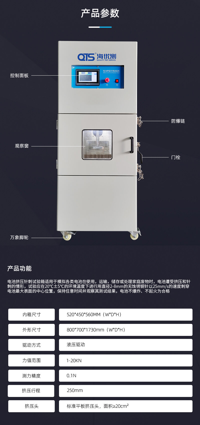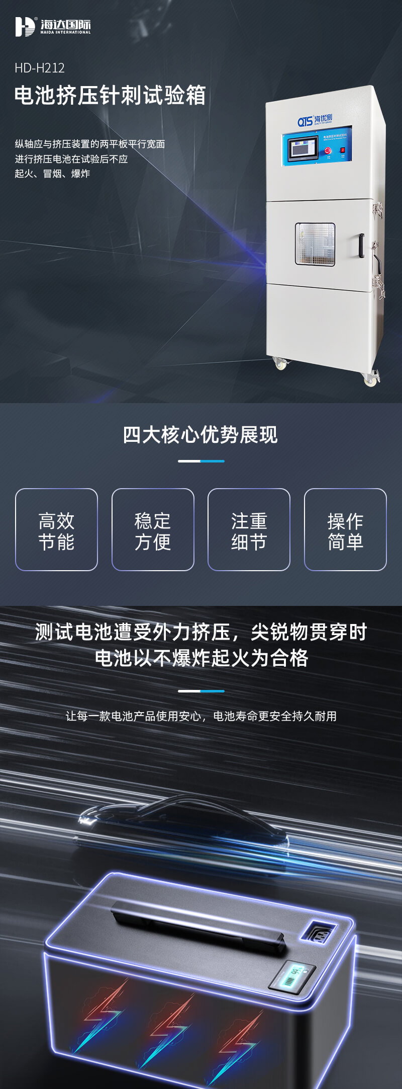 HD-H212電池擠壓針刺試驗箱適用于模擬各類電池在使用,運輸,儲存或處理家庭廢物時,電池遭受擠壓和針刺的情形,用直徑2-8mm的無蝕銹鋼針以25mm/s的速度刺穿電池最大表面的中心位置,保持任意時間并觀察其測試結果,電池不爆炸、不起火為合格。